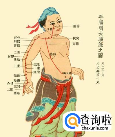 第二张图是【手阳明大肠经图】。口诀:手阳明穴起商阳,二间三间合谷藏,阳溪偏历历温溜,下廉上廉三里长,曲池肘髎迎五里,臂臑肩髎巨骨起,天鼎浮突接禾髎,终以迎香二十止.