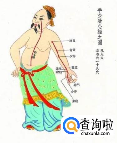 第五张图是【手少阴心经图】。其口诀为:手少阴心起极泉,青灵少海灵道全,通里阴郄神门下,少府少冲小指边。这是六张图中穴位最少且口诀也较为好记的一张图,大家加油哦。