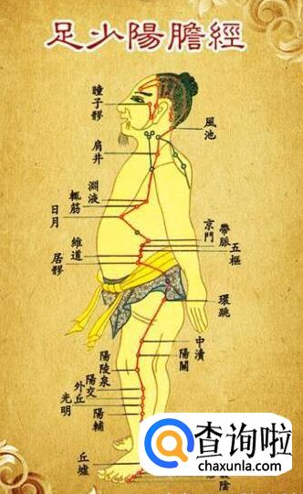 第十一张图是【足少阳胆经图】其口诀为:足少阳经瞳子髎,四十四穴行召召。听会上关颔厌集,悬颅悬厘曲鬓翘,率谷天冲浮白次,窍阴完骨本神邀,阳白临泣目窗毕,正营承灵脑空摇,风池肩井渊腋部,辄筋日月京门标,带脉五枢维道续,居髎环跳风市召,中渎阳关阳陵泉,阳交外丘光明宵,阳辅悬钟丘墟外,足临泣与地五会,侠溪窍阴四趾端。