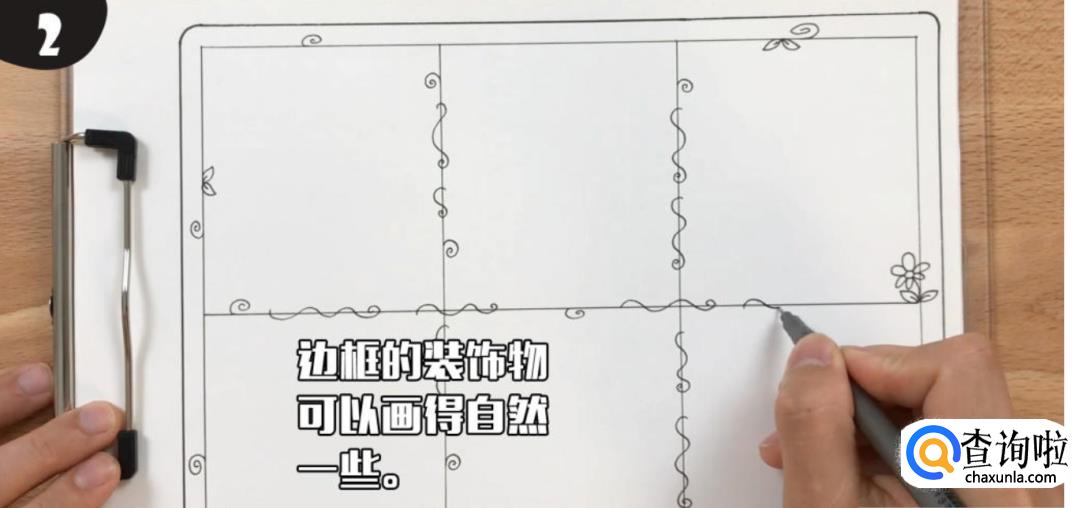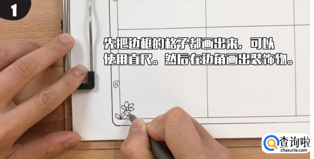 首先,把边框的格子都画出来,可以借助直尺操作,在边角画出你喜欢的装饰物。