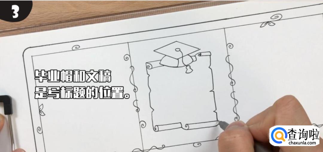 在中上部分,也就是标题的位置画出毕业帽和文稿。