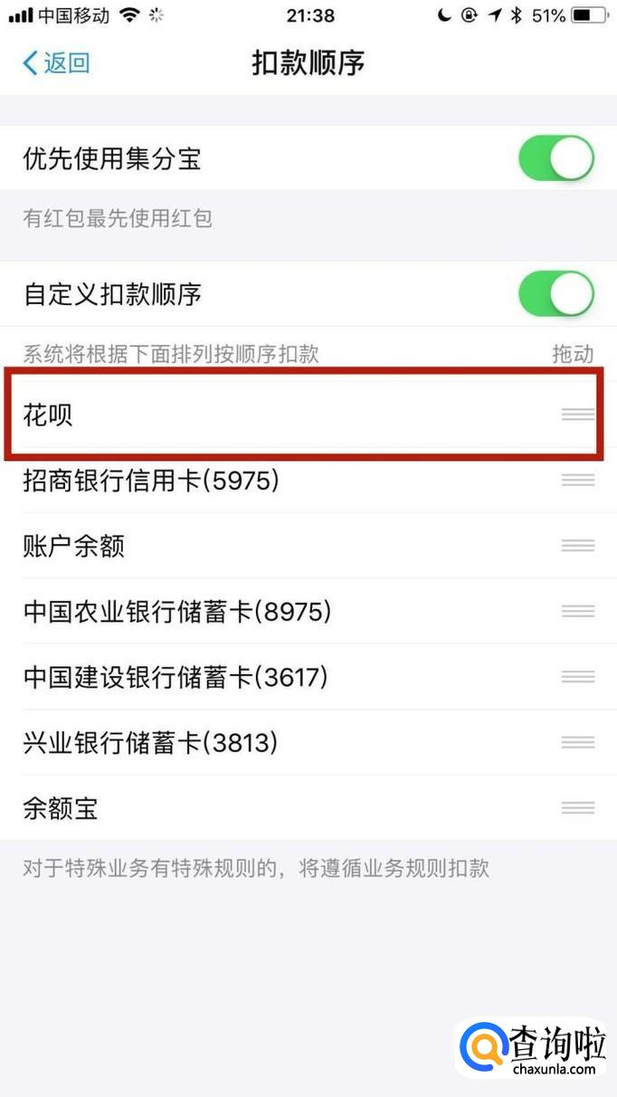 最后将花呗拖到第一位,如下图所示。这样操作完成,我们在下次用支付宝进行购物的时候就会优先使用花呗了。