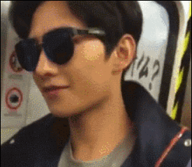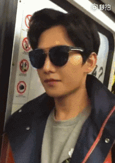 带着墨镜,然后还有点害羞的样子