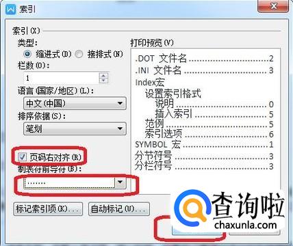 然后,我们点击“引用”,“插入索引”,弹出索引面板,我们设置一下,设置页码右对齐,然后设一下制表符前导符,点击确定,就插入索引了,插入效果如下图所示。
