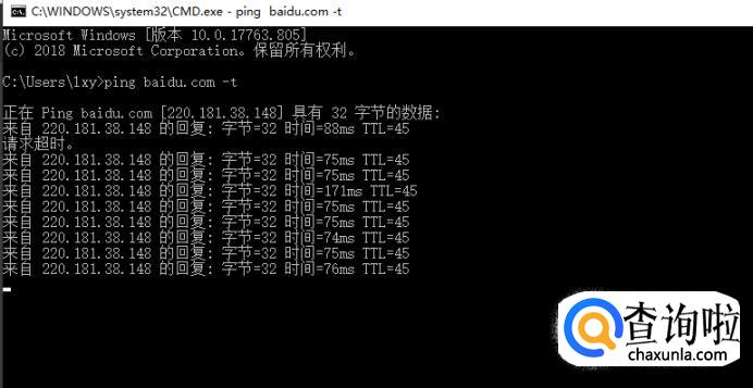 输入“CMD”打开黑窗口,进入黑窗口后,再次输入指令ping baidu.com –t,然后,单击 enter,可以看到目前网速。