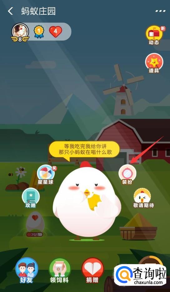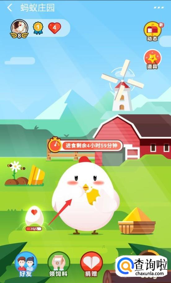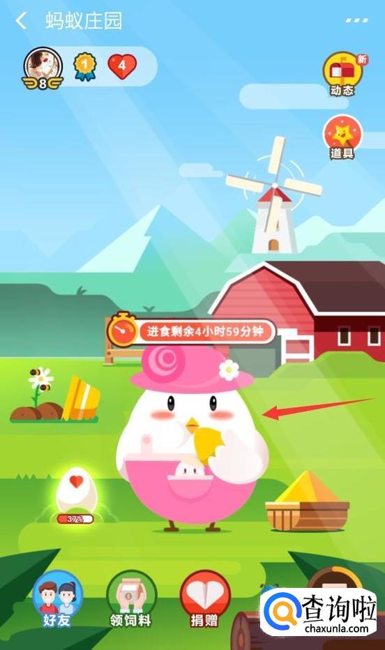 接下来就会进入到蚂蚁庄园,此时就可以看到自己喂养的小鸡,如果要给小鸡换装扮的话,那么单击下小鸡。