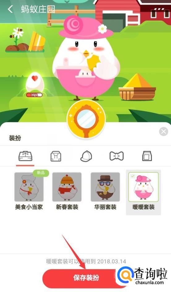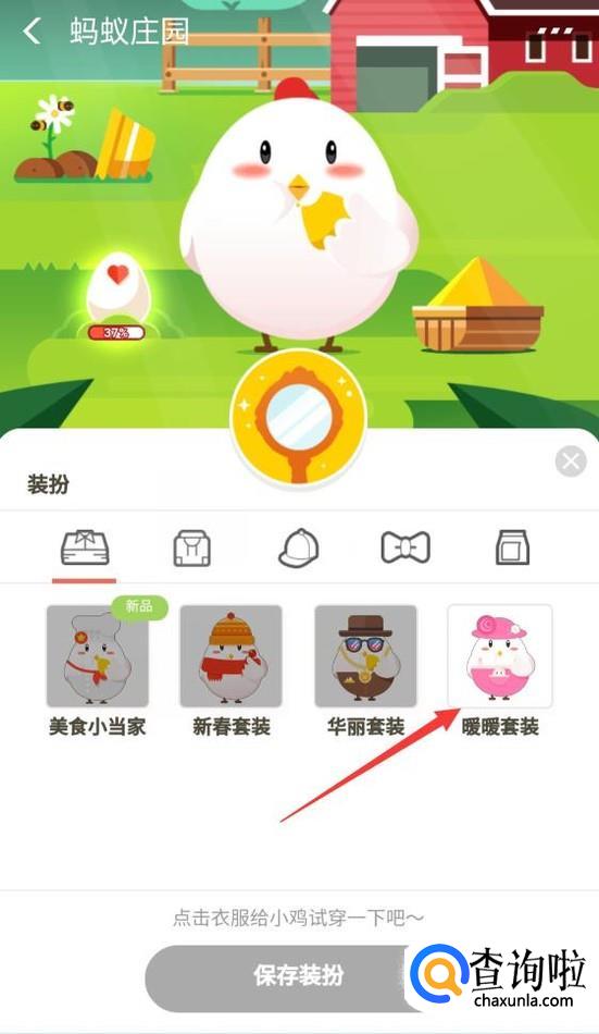 点击保存按钮后会回到如图所示面板,此时就会发现小鸡已经换上了新装扮了。