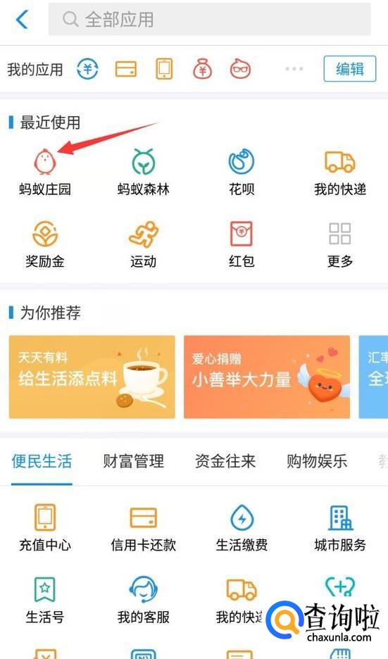 然后会进入到应用面板,此时我们在“购物娱乐”模块找到“蚂蚁庄园”应用,找到之后单击该应用。