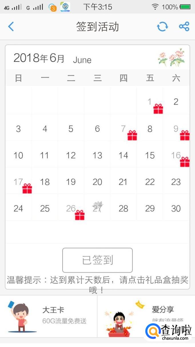 点击签到两个字,你会看到签到的天数变成的灰色,说明签到成功啦。