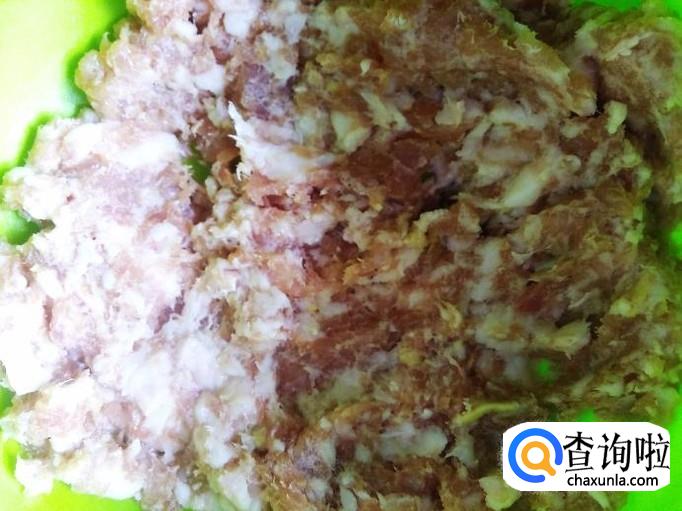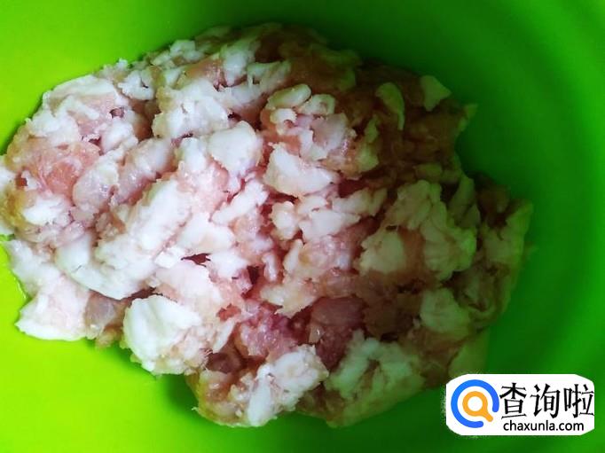 猪肉最好是要带有肥肉的,绿豆吸收肥肉的油汁更松软。把猪肉剁成肉饼。