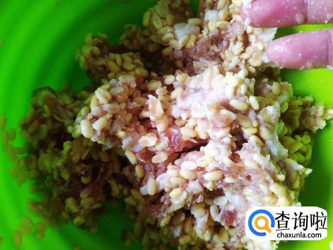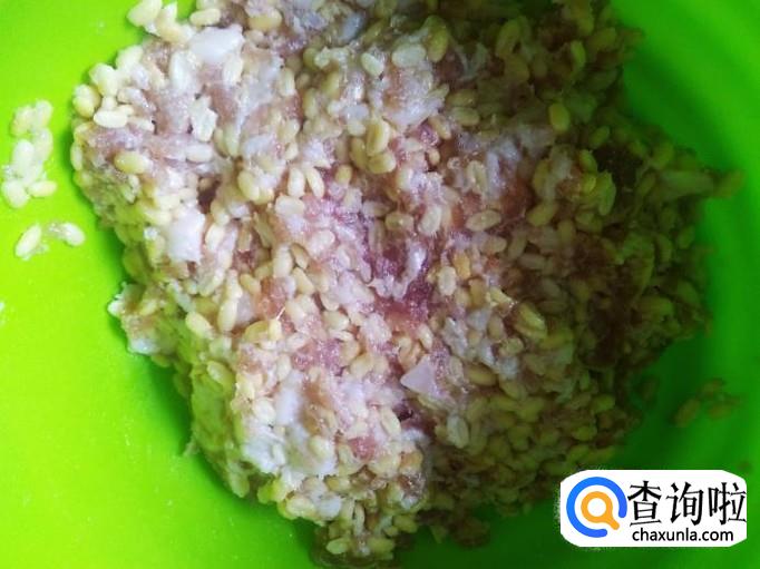 绿豆和肉饼混合,然后再用手抓捏5分钟左右,捏到肉饼和绿豆粘在一起为止。