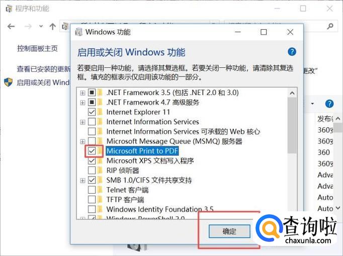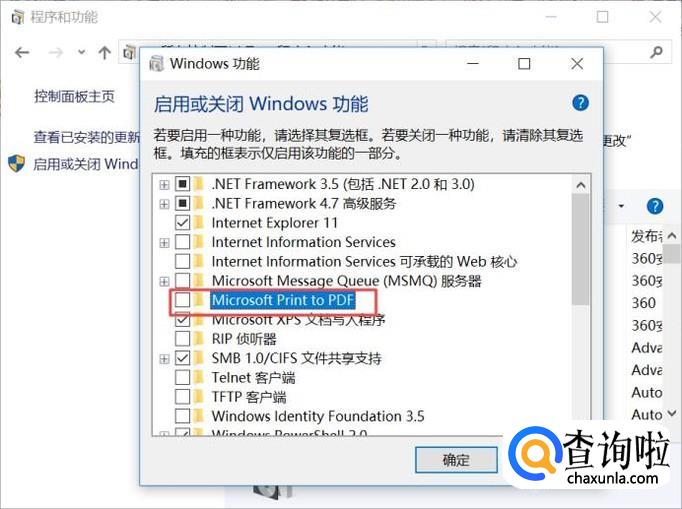 进入Windows功能后,我们找到Microsoft Print to PDF;