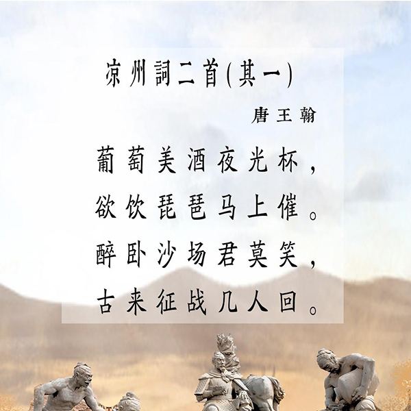 《凉州词二首》是唐代诗人王翰的组诗作品。而“葡萄美酒夜光杯”出自其中的第一首。全诗为:葡萄美酒夜光杯,欲饮琵琶马上催。醉卧沙场君莫笑,古来征战几人回。意思是:酒筵上甘醇的葡萄美酒盛满在精美的夜光杯之中,歌伎们弹奏起急促欢快的琵琶声助兴催饮,想到即将跨马奔赴沙场杀敌报国,战士们个个豪情满怀。今日一定要一醉方休,即使醉倒在战场上又何妨?此次出征为国效力,本来就打算马革裹尸,没有准备活着回来。