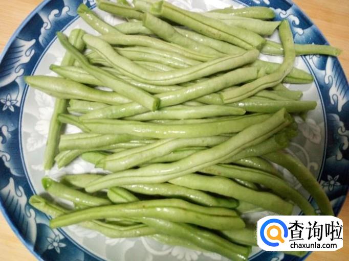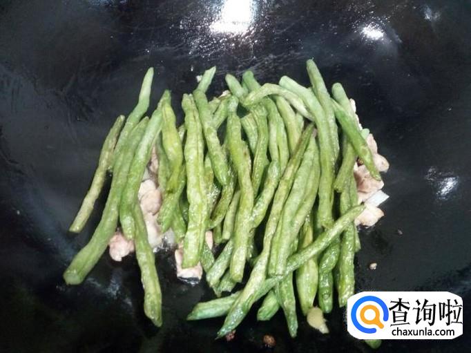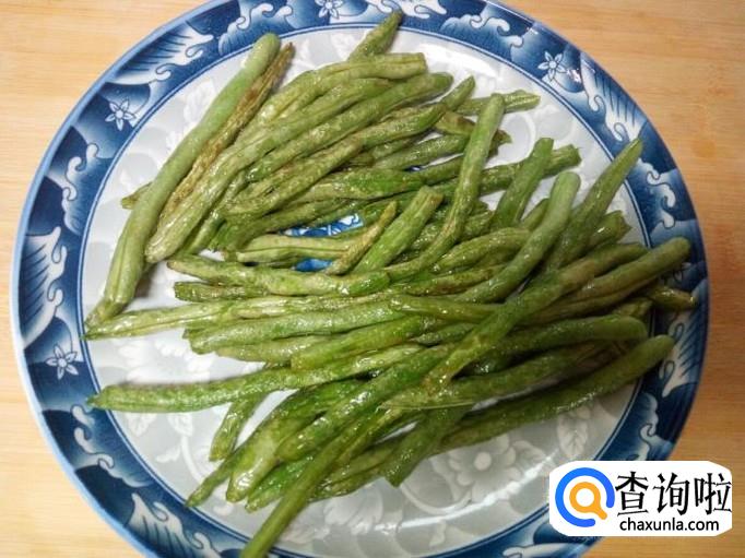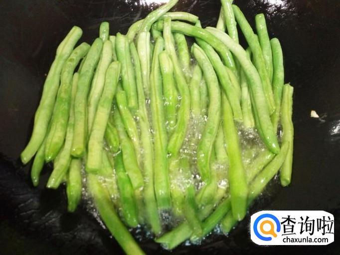 锅里放入比平时炒菜多一些的油加热,油六成热时,放入芸豆油炸。油炸至芸豆变软,表面发皱,盛出备用。