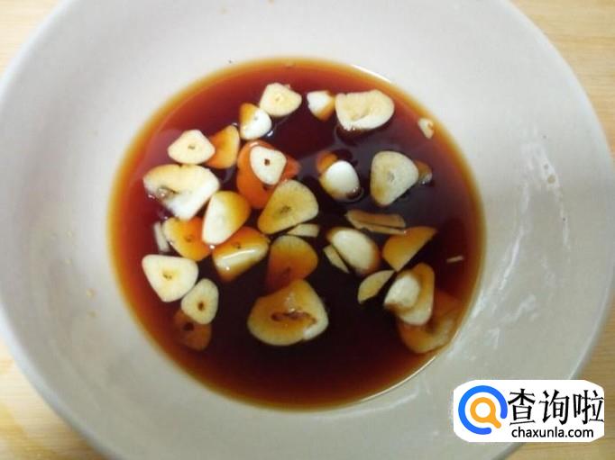 碗里放入盐,味精,料酒,酱油,蚝油,少许白糖,兑水,放入蒜,调和成料汁。