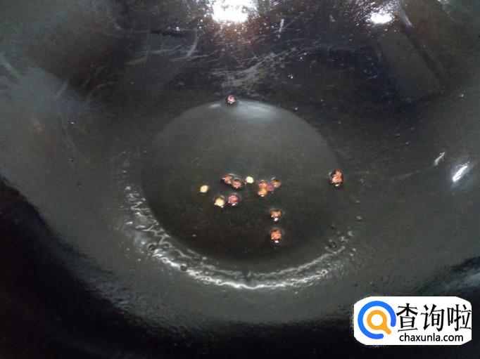 盛出炸芸豆多余的油,锅内留底油,放入花椒爆锅,放入肉片翻炒。