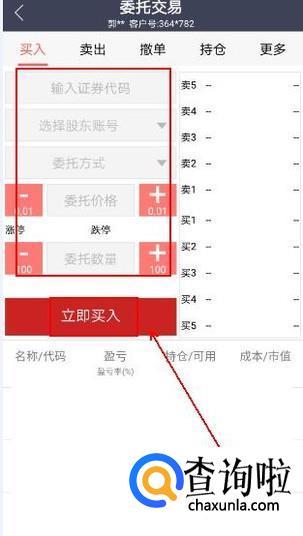 输入我们要购买的证券代码等信息后点击“立即买入”按钮即可。