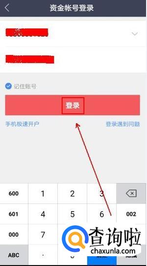 在“资金账号登录”窗口中输入账号和密码并点击“登录”按钮。