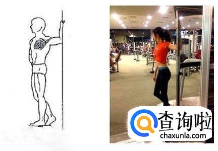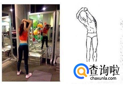拉伸者双脚开立,一侧手臂屈肘抬起,然后用另外一只手去抓住屈肘手臂的上臂,并慢慢用力向一侧拉,以拉伸侧背部肌肉,保持这个动作15秒,然后再换另一侧。