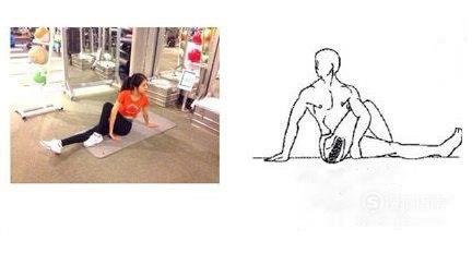 拉伸者坐于垫上,保持一只脚伸直,另一只脚屈膝,然后身体向一侧慢慢转体至双手放于身体一侧,并保持15秒以拉伸腿部外展肌群,然后再换另一侧。