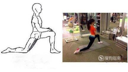 拉伸者保持单脚跪地箭步,身体直立,双手放于屈膝膝盖上,然后保持跪地腿膝盖不动,身体重心前移并拉伸腹股沟,然后再换另外一侧拉伸。