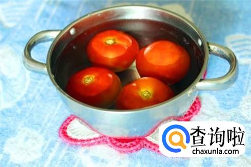 凉拌西红柿是一定要去皮的,西红柿清洗干净之后放在碗里,用开水烫一下,一分钟后西红柿的皮就会很容易被撕下来了。