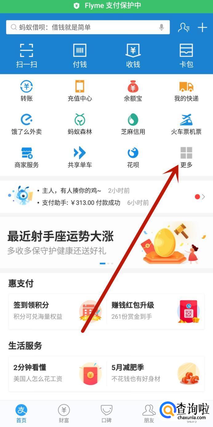 进入支付宝首页面,点击“更多”,如图所示。