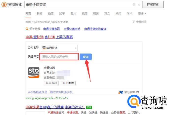 在搜索结果页面,在图示位置输入快递单号,点击“查询”即可。