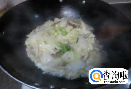 大蒜苗爆香后,倒入白菜,待白菜要熟时,倒入粉皮,在倒入适度水,在放入盐,酱油,鸡精等调料,直到炖熟后就可以出锅了。