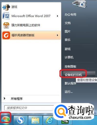 或者,点击开始菜单,点击“设备和打印机”。