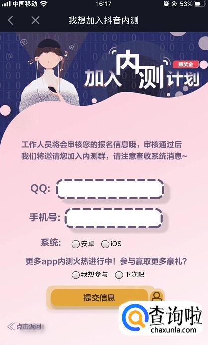 最后,我们根据要求输入QQ号、手机号,选择你的手机系统,然后点击【提交信息】,然后等待抖音审核通过之后就可以加入内测了。