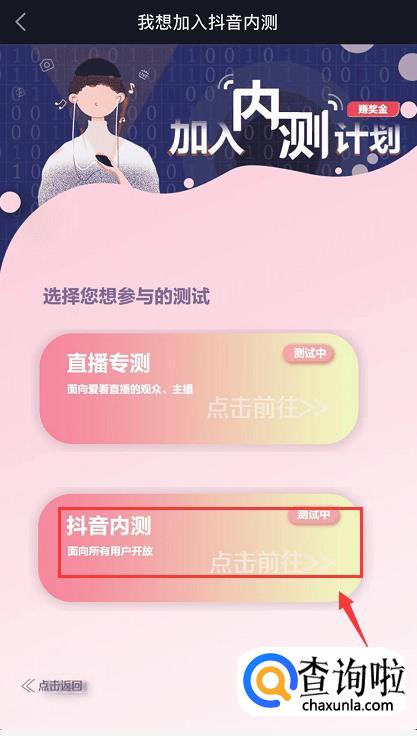 点击之后,选择你先想要参与的测试,有直播专测和抖音内测,这里我们选择【抖音内测】,点击进入。