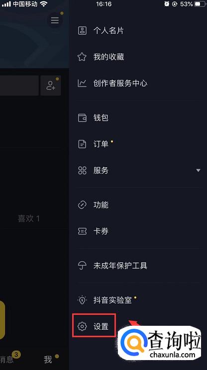 点击之后弹出菜单页面,在底部有一个【设置】功能,点击进入。