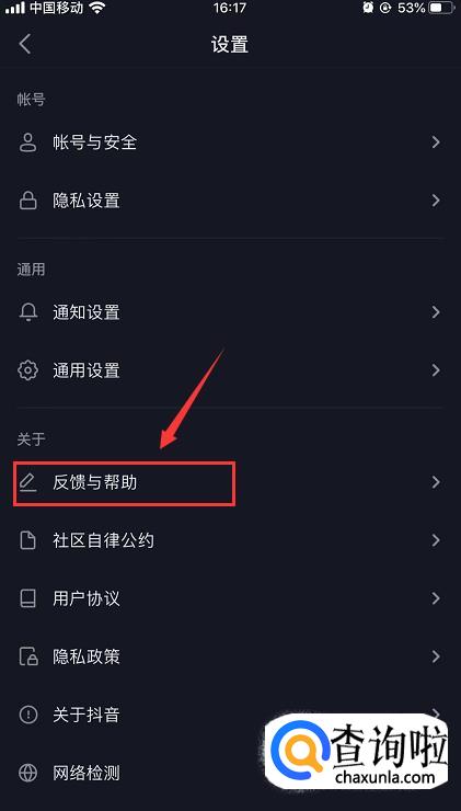 进入设置页面后,在“关于”一栏中找到【反馈与帮助】,点击进入。