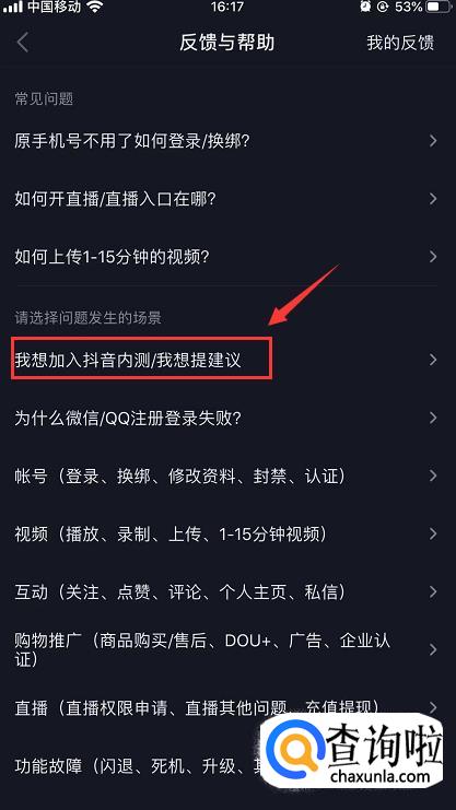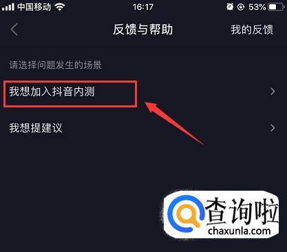 进入反馈与帮助页面后,找到“请选择问题发生的场景”,在下方点击【我想加入抖音内测/我想提建议】,然后在下一个页面选择【我想加入抖音内测】。