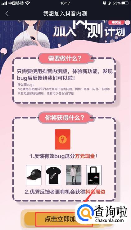 在我想加入抖音内测页面可以看到有个活动,只需要使用抖音内测版,体验新功能,发现bug后反馈给系统即可。我们点击下方的【点击立即加入】。