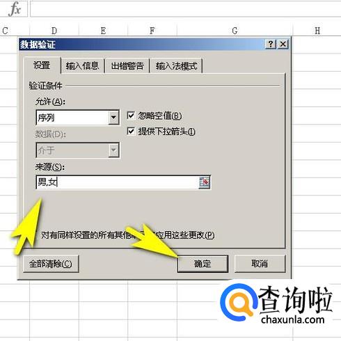 接着,在来源这里原编辑框内输入:男,女;注意,男女中间的逗号要在英文状态下输入。然后,点确定。