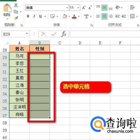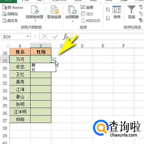 对话框关闭,再看表格这里,鼠标点击B29;右侧显示出三角按钮,点击此按钮,弹出男、女的选项,我们选择即可。