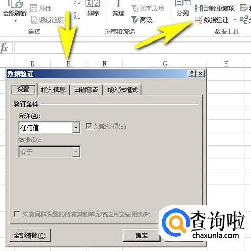 接着,点:数据验证;弹出数据验证对话框。