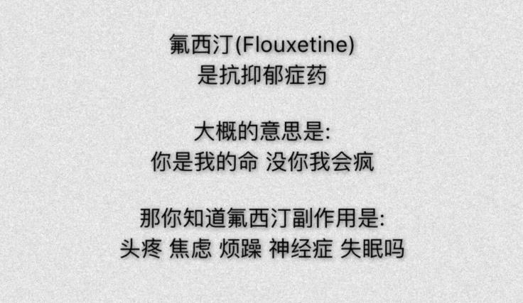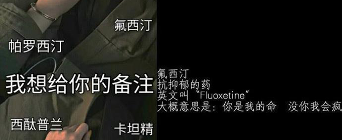 “氟西汀”是一种抗抑郁药的英文名字,原名叫“Fluoxetine”。网友们用“氟西汀”来做备注,说明这个人是在他的黑暗世界里,给他带来阳光的那一个人,是这个冰冷世界他唯一的羁绊。如果你的另一半给你的备注是氟西汀,那你一定要好好的珍惜!