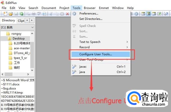 首先我们打开EditPlus软件,点击顶部的Tools菜单,然后选择下来菜单中的Configure User Tools选项,如下图所示