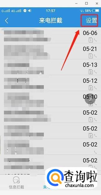 这时会看到你手机上所有的电话拦截记录,点击右上角“设置”