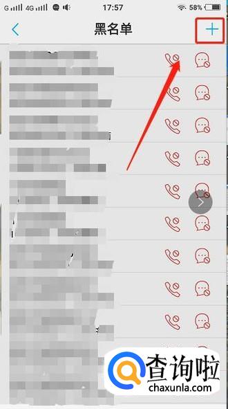 这时你看到的是你所有加入黑名单的手机号码,然后点击右上方的加号按钮,就可以直接添加你想要加入黑名单的号码了。并且手机屏幕下方会有三种选择方式,帮你尽心找到要添加黑名单的号码。如图所示: