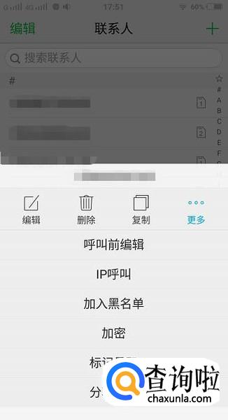 最简单的方法就是在通讯记录或者联系人里找到你要加入黑名单的号码,长按会出现很多选项,然后点击“更多”就会出现黑名单选项,直接加入就可以,如图所示: