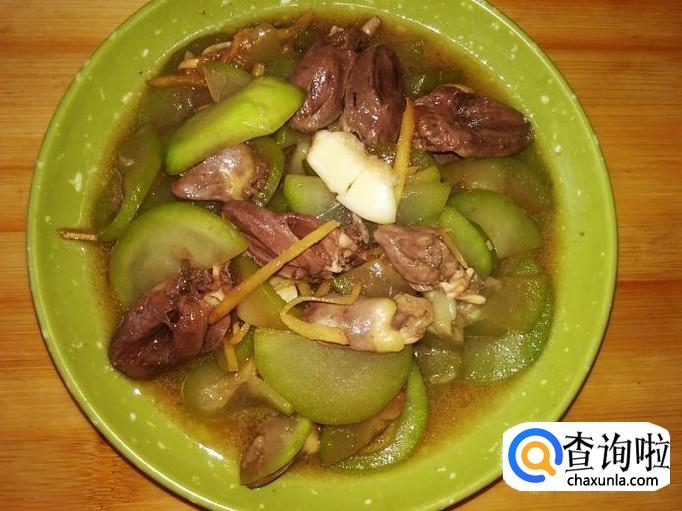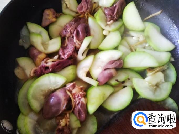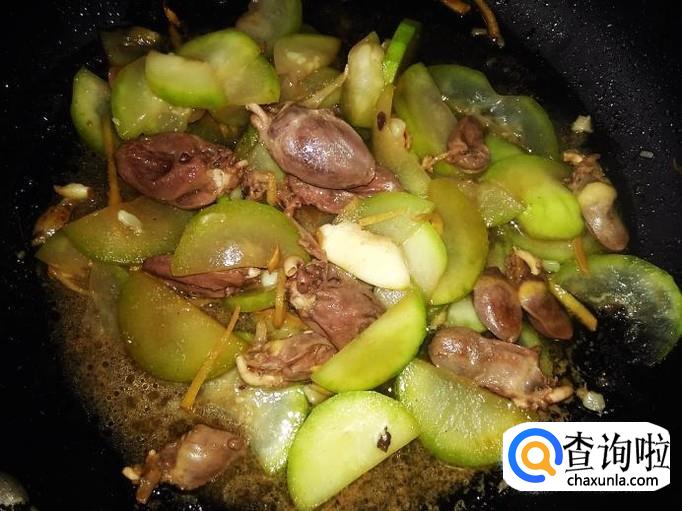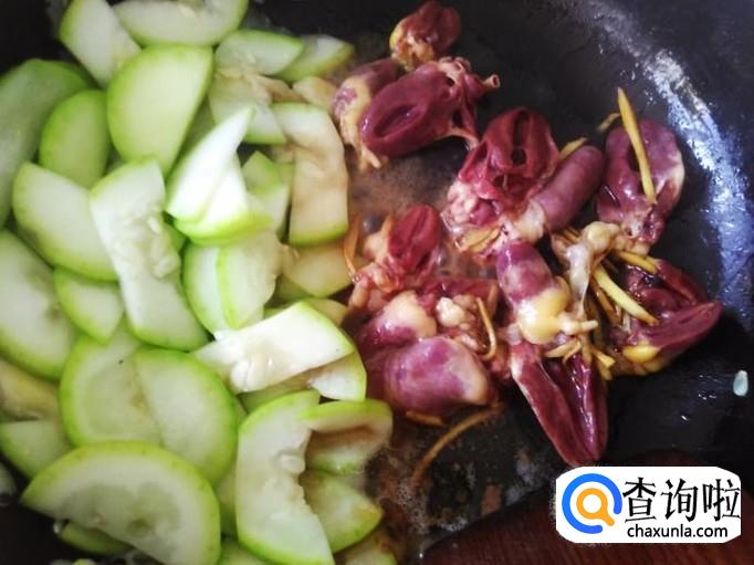 葫芦瓜150克,鸡心200克,姜丝、蒜米适量,1勺生抽,1勺料酒。