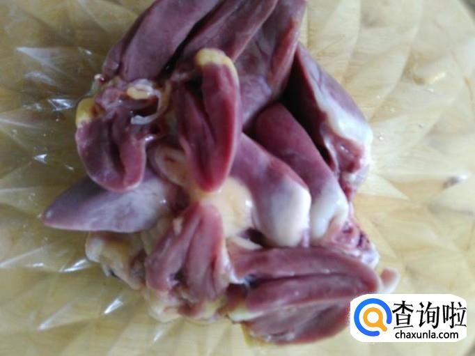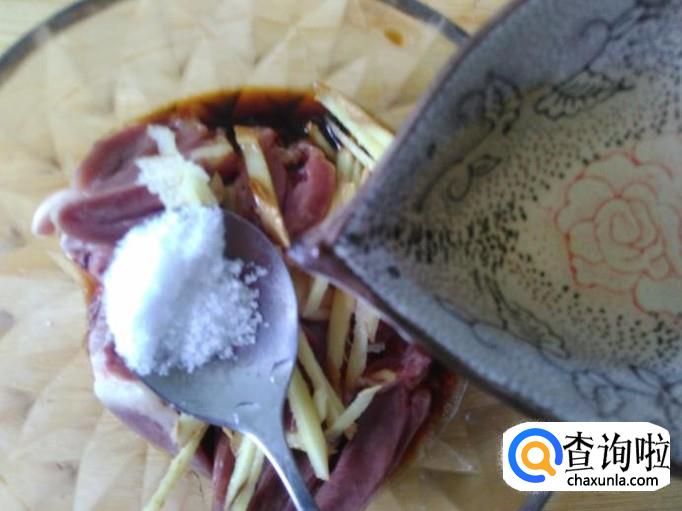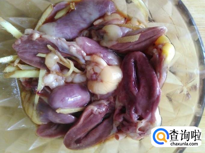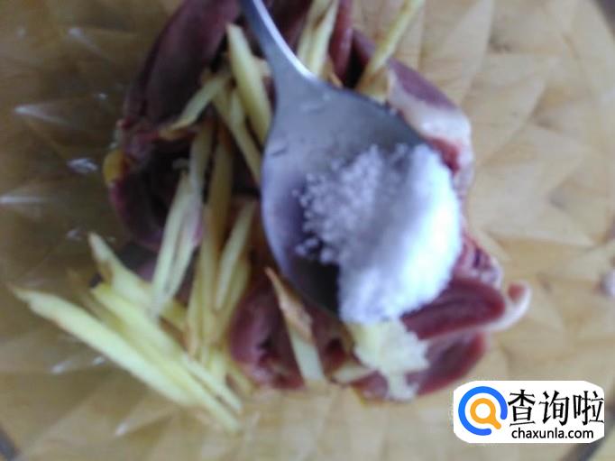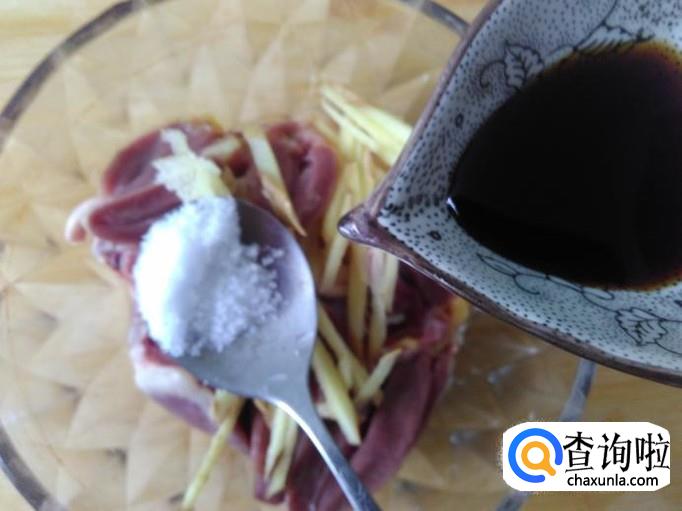 鸡心洗干净,然后把每个鸡心切成两边,加适量的盐、姜丝。