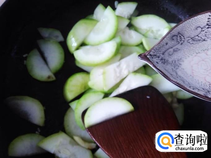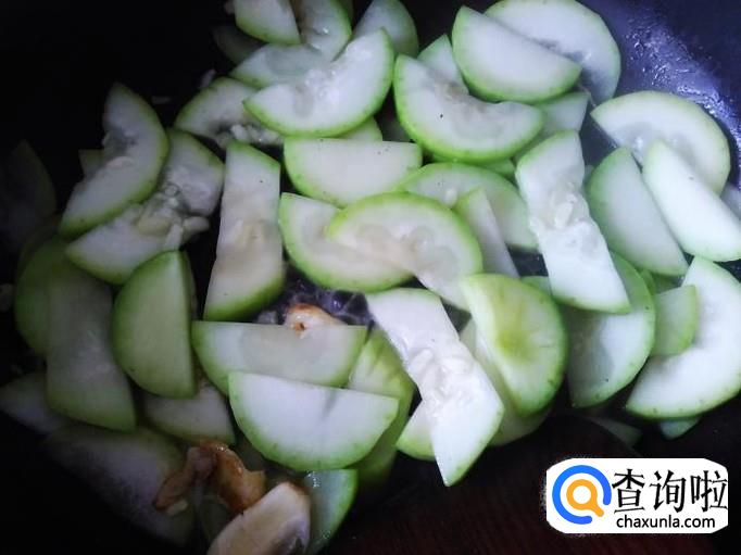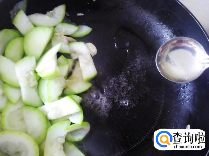 然后把炒软的葫芦瓜铲到锅边,再下1勺香油到锅空格里。