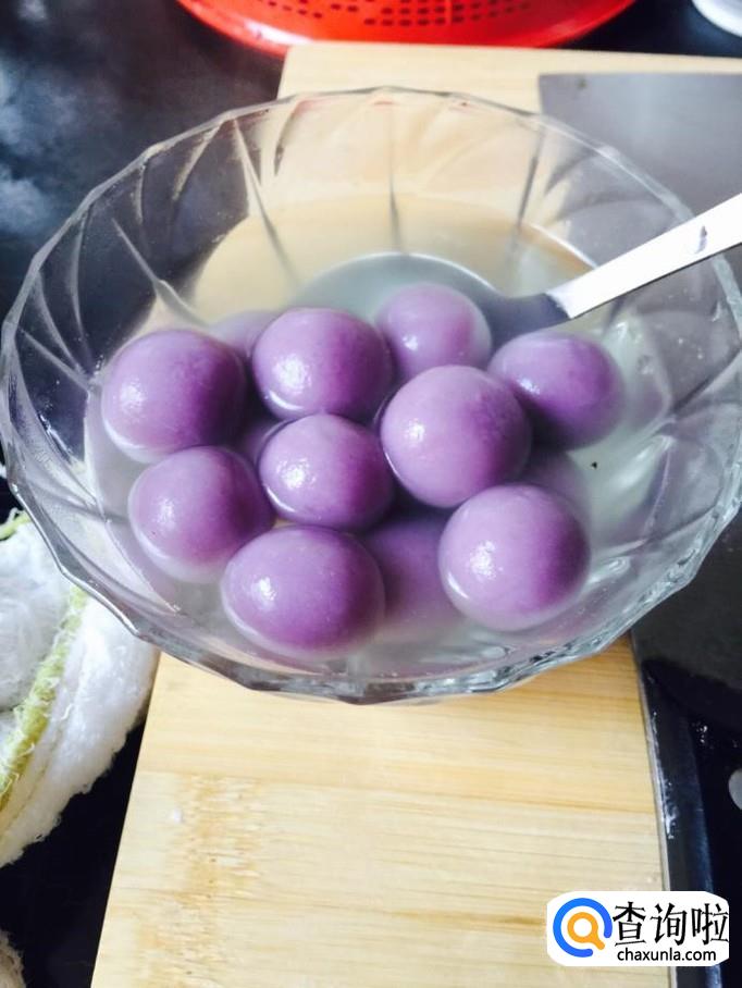 然后我们在锅中烧水,把做好的汤圆放入开水锅中煮熟,捞出来盛入碗中,美味的紫薯水晶汤圆就制作完成了!