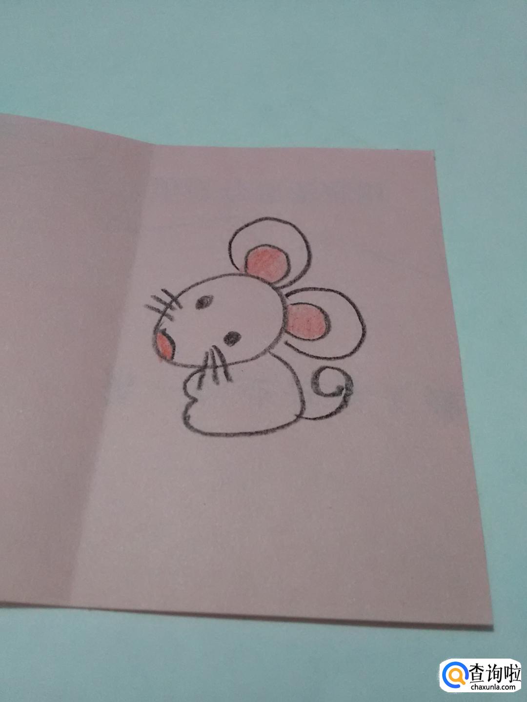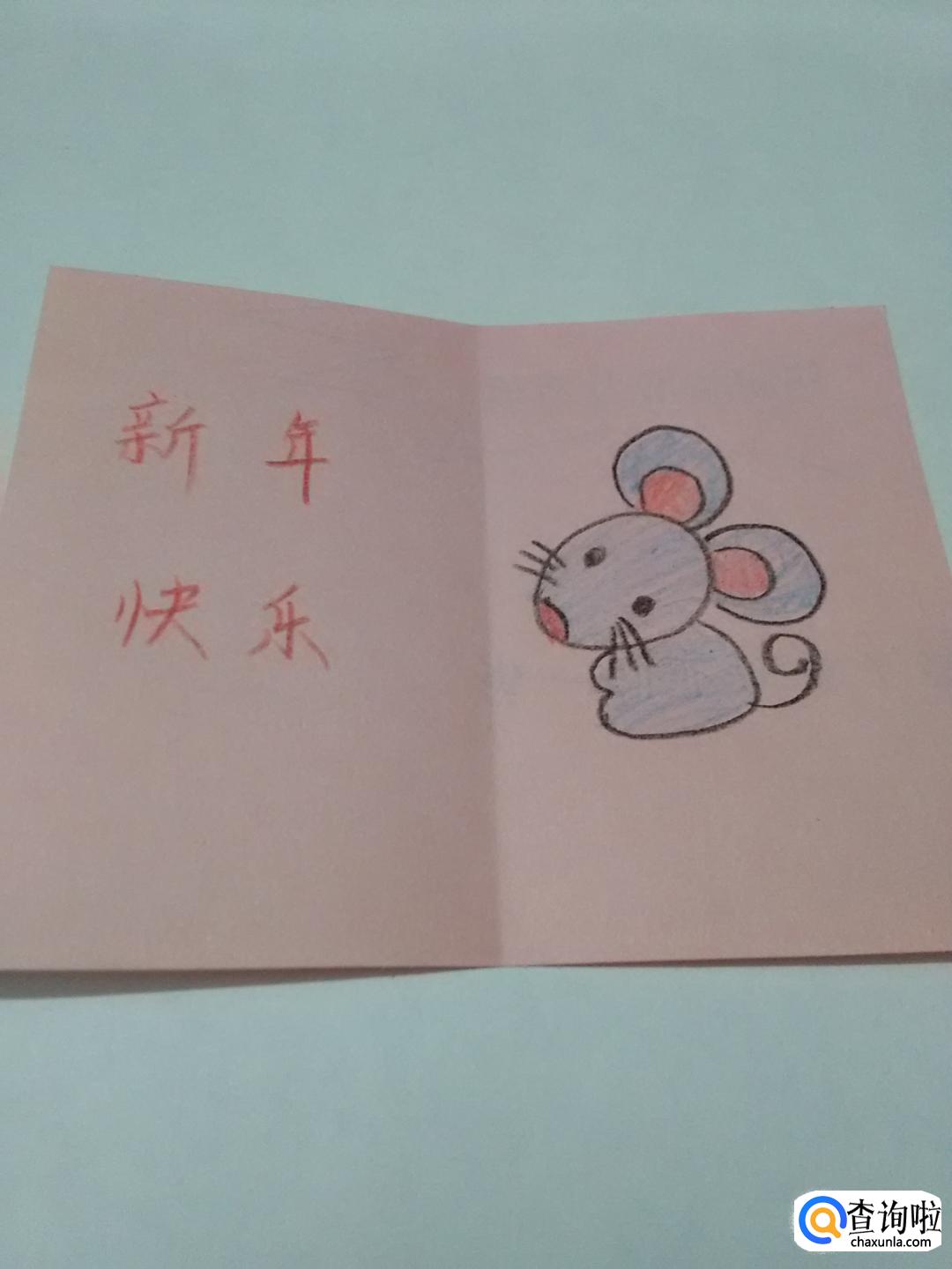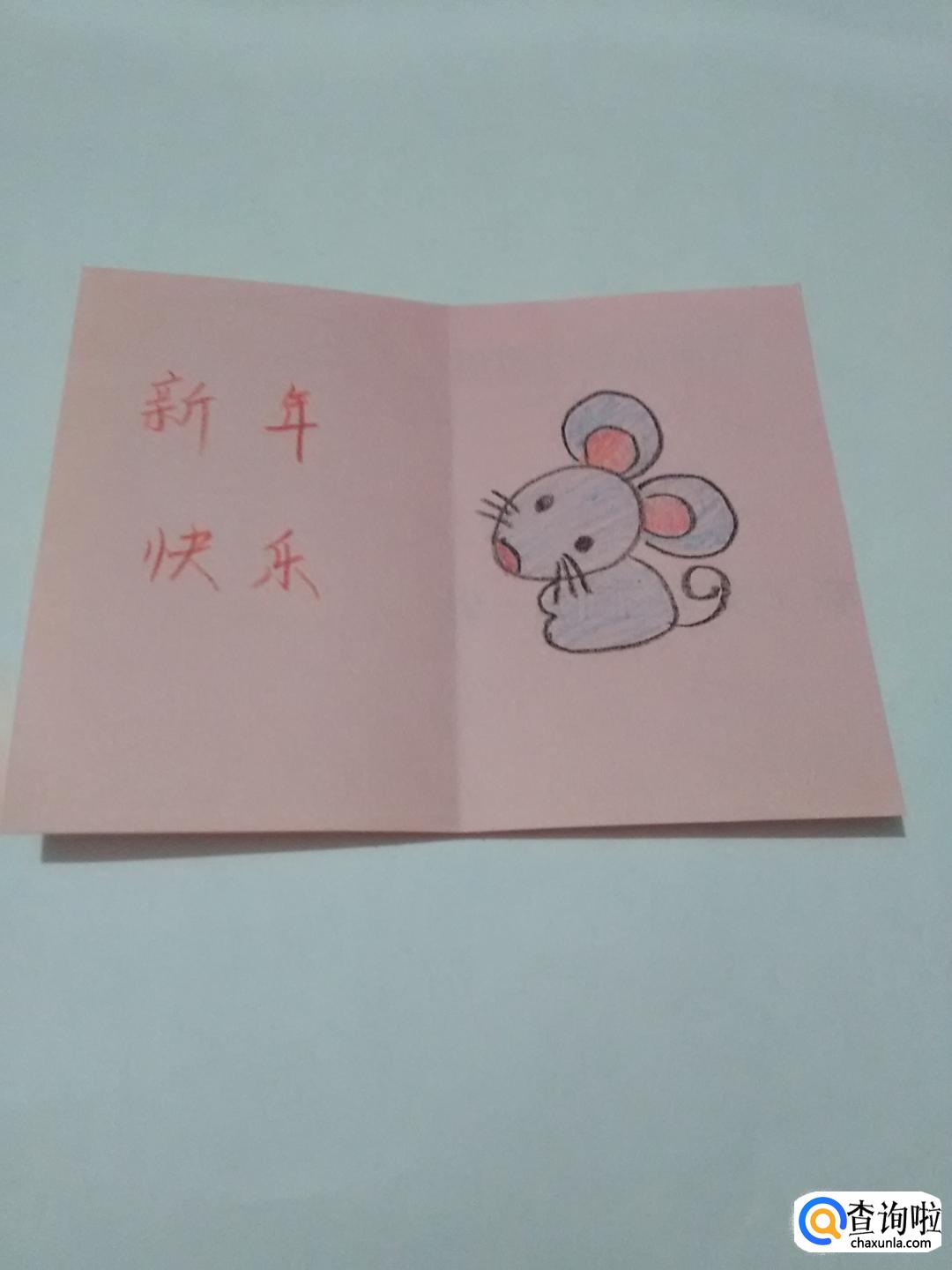 用红笔在彩纸左半边写上新年快乐四个字,鼠年的新年贺卡就做好了。