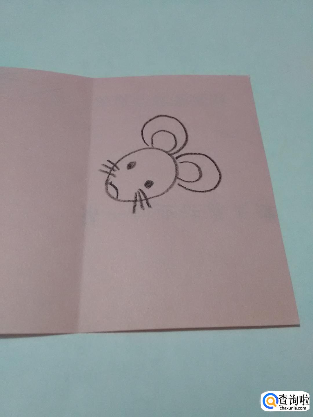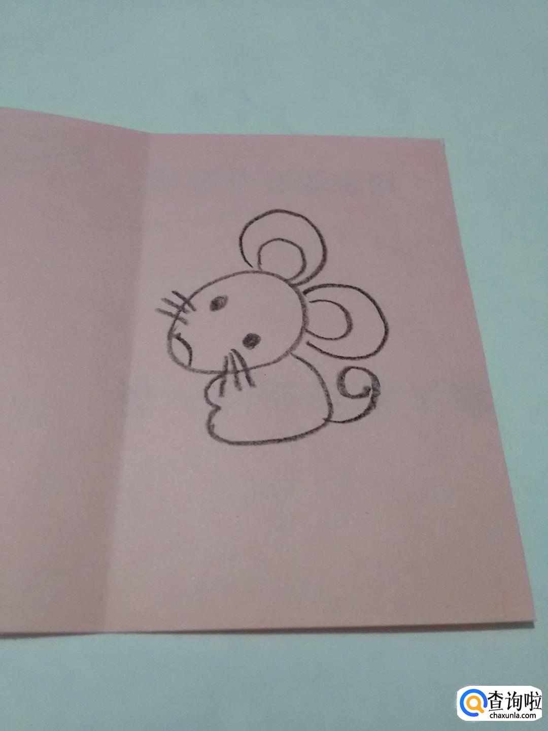 从胡须向下,画一个反写的3,3的末端向右上方一直画到老鼠头部,表示老鼠的身体。